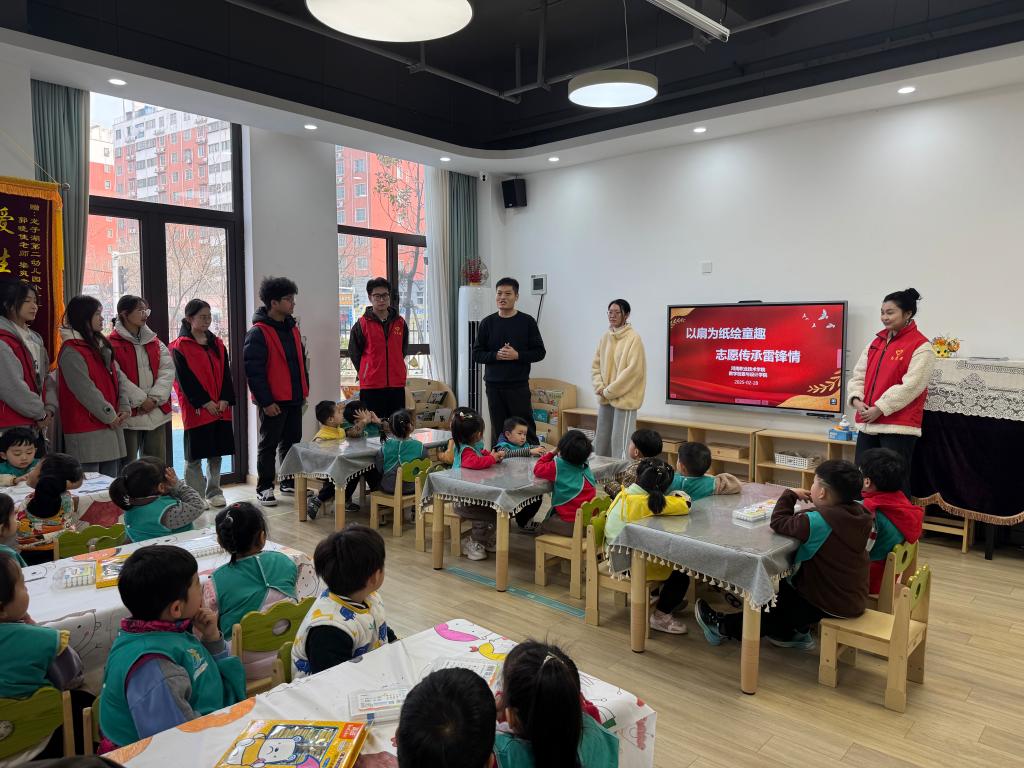 为践行雷锋精神,创新志愿服务形式,2月28日下午,太阳集团tyc539师生志愿者团队走进郑东新区龙子湖第二幼儿园,开展了"以扇为纸绘童趣,志愿传承雷锋情" 主题志愿服务活动。