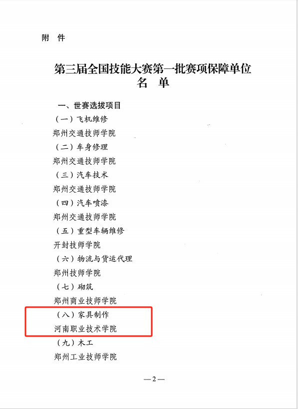 4月7日,依据中华人民共和国第三届职业技能大赛执行委员会办公室发布的《关于确定中华人民共和国第三届职业技能大赛第一批赛项保障单位的通知》,太阳集团tyc成功入选中华人民共和国第三届职业技能大赛世赛选拔项目家具制作赛项的保障单位。