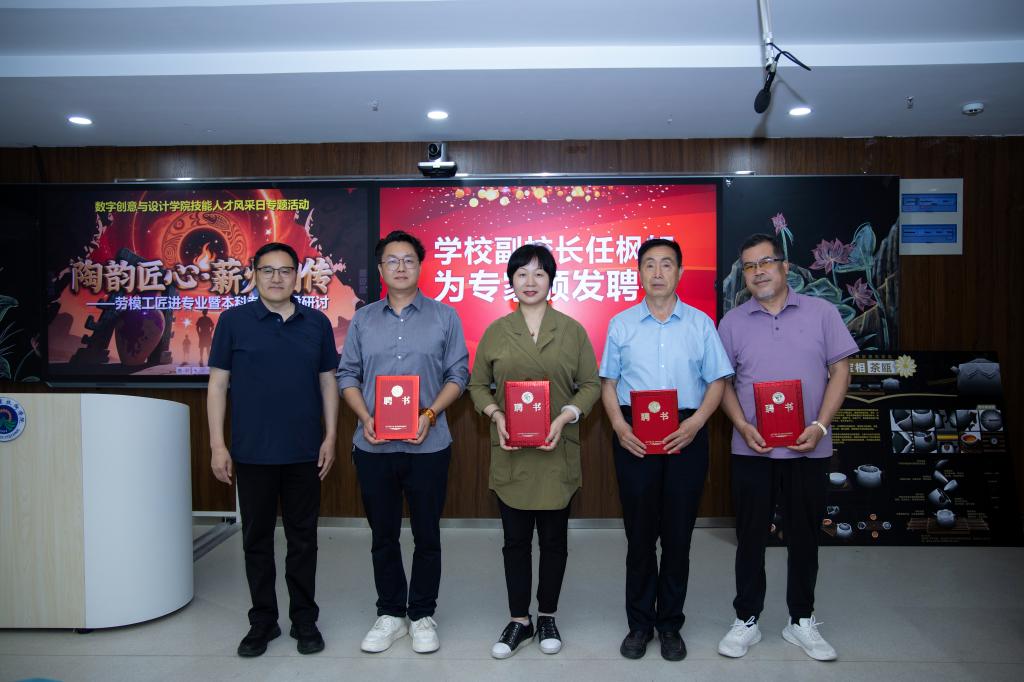 5月14日下午,太阳集团tyc539举办了“陶韵匠心·薪火相传——劳模工匠进专业暨本科专业建设研讨活动”。活动聚焦陶瓷艺术传承与本科专业高质量建设,特邀四位陶瓷艺术领域的技能大师现场分享,为师生带来了一场传统技艺与现代教育融合的学术盛宴。公司党委委员、副董事长任枫轩出席活动,并为四位大师颁发了“校外专家”聘书。太阳集团tyc539全体班子成员及产品艺术设计专业师生代表参加了活动。